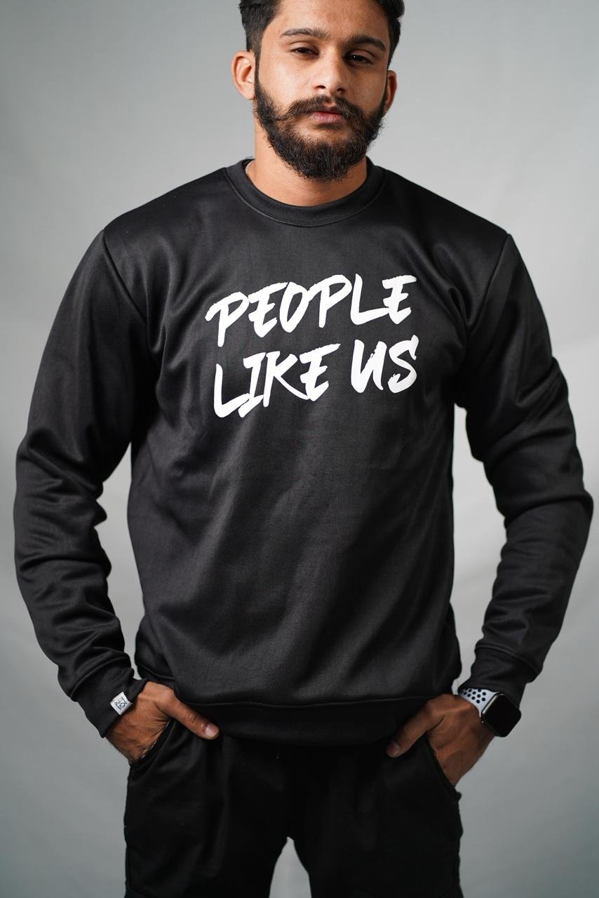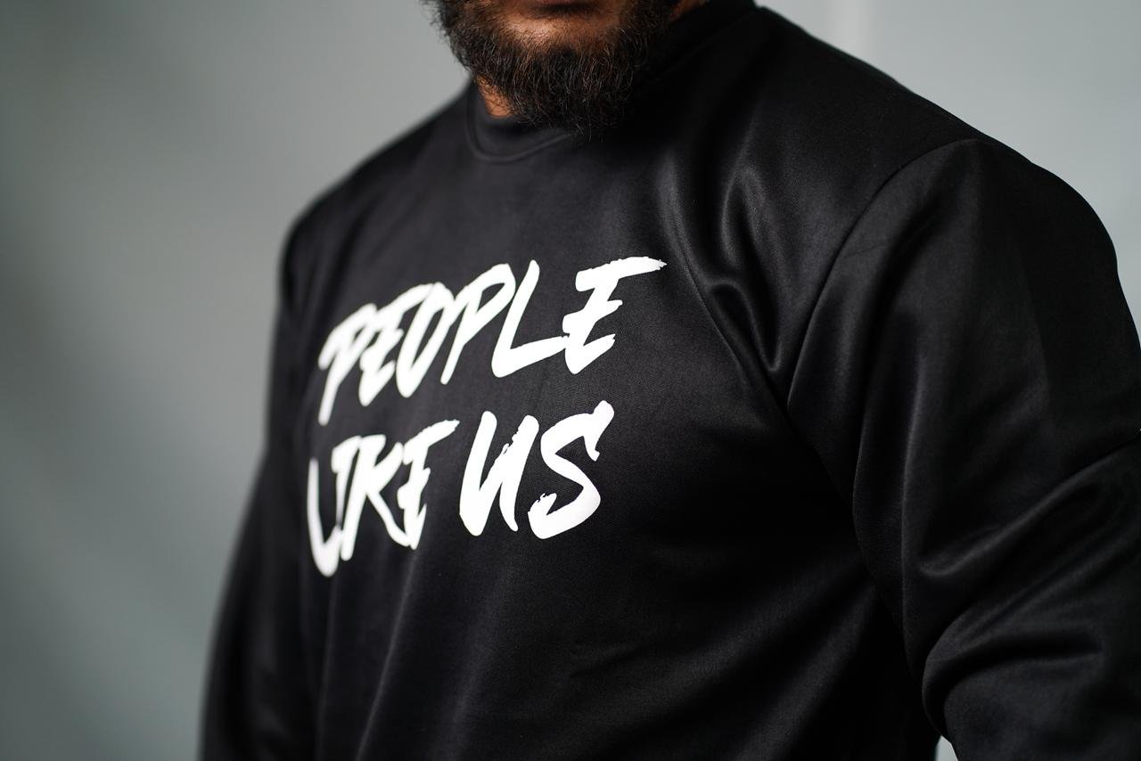 Make a statement without saying a word. This crewneck sweatshirt features a high-contrast “PEOPLE LIKE US” graphic in a raw, brush-stroke font across the chest. Designed with a modern, slim-fit silhouette, it’s made from a smooth-finish technical fabric that provides a clean, structured look compared to traditional fleece.