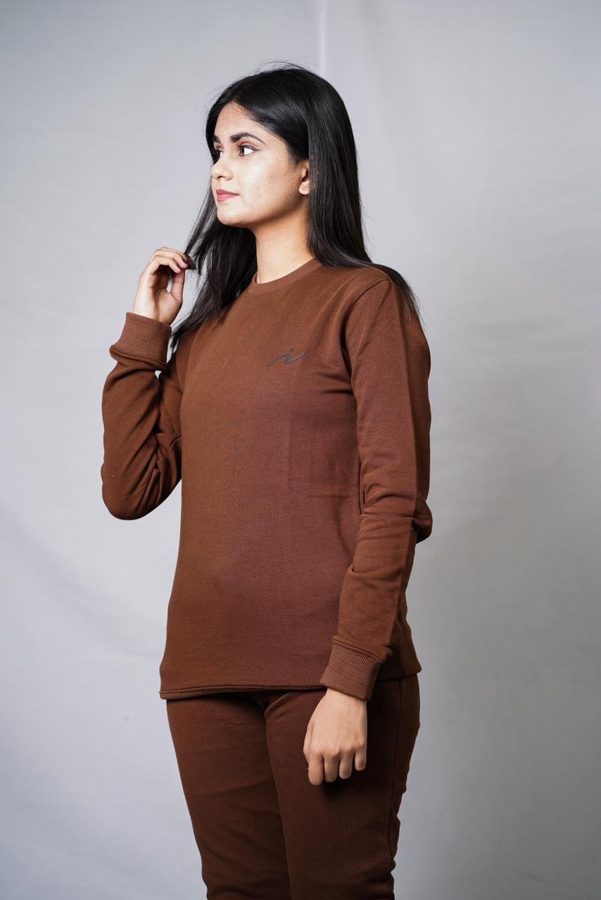The Top: A classic crewneck sweatshirt with a clean, round neckline (no hood). It features a subtle, minimalist logo detail on the left chest and fitted ribbed cuffs on the sleeves to keep the warmth in.